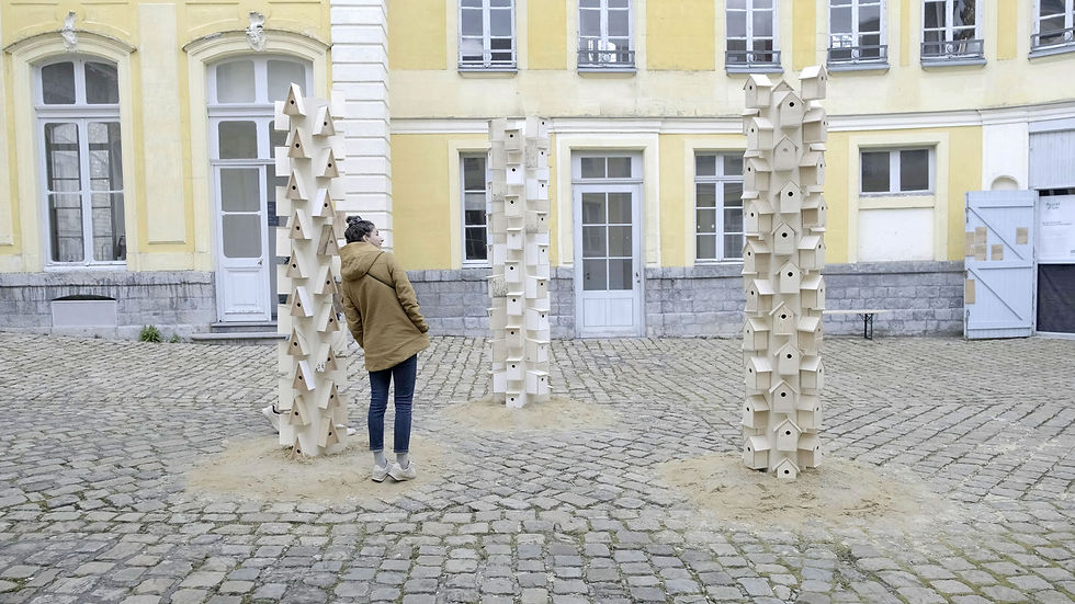 S’articulant autour de l’objet-nichoir, l'installation constituée de trois totems questionne la notion de refuge dans un contexte de biodiversité menacée. Si les nichoirs constituent un abri pour les oiseaux de nos villes – les « petits invisibles » –, leurs formes calquées sur l’habitat humain interrogent néanmoins sur l’uniformisation de notre rapport au vivant et témoignent de l’absence d’espaces sauvages due à l’urbanisation croissante. Dissimulés à l’intérieur des structures, des capteurs de mouvement déclenchent des sons naturels en fonction du passage des visiteur·euse·s à proximité de l’installation, invitant le public à interagir avec l'œuvre pour créer un écosystème sonore en constante évolution. Se pencher, tourner autour, traverser...les visiteur·euse·s sont amenés à entrer dans une sorte de danse rituelle comme pour réinventer notre lien au vivant. Cet engagement corporel incite chacun·e à tendre l’oreille pour accorder une écoute attentive à ces « petits invisibles », se mettre à leur portée et faire partie du chœur.